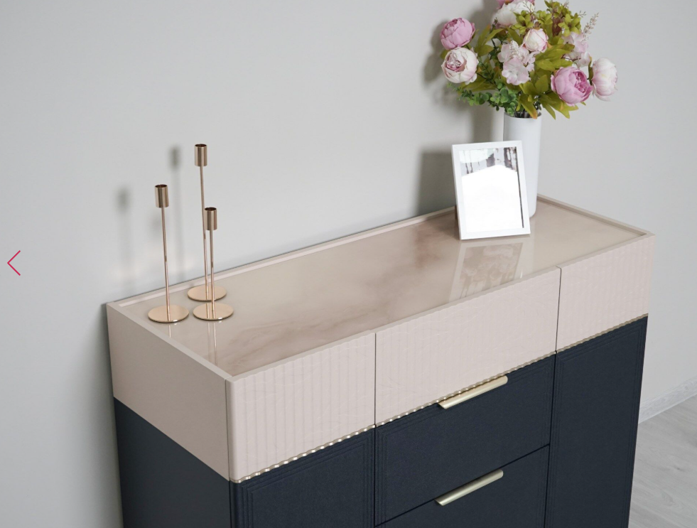 Стеклянный топ комода декорирован дизайнерским рисунком «Мрамор». Легкое мерцание глиттера придает поверхности глубину и добавляет в интерьер нотку роскоши.