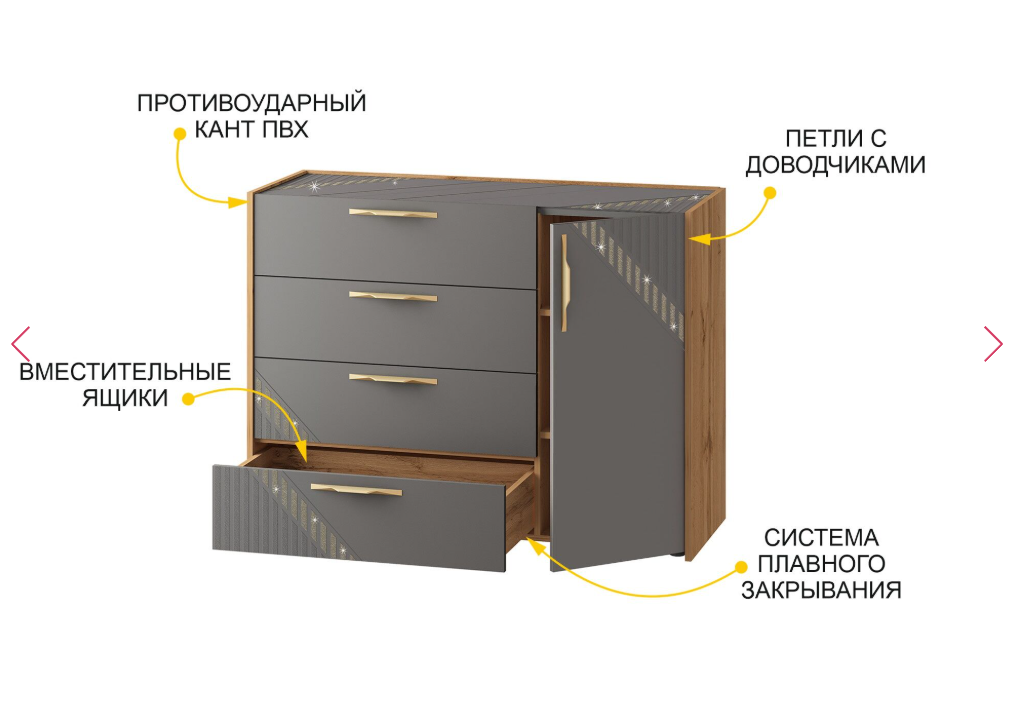Выдвижные ящики комода оснащены системой плавного закрывания скрытого монтажа, благодаря чему модулем приятно и удобно пользоваться.