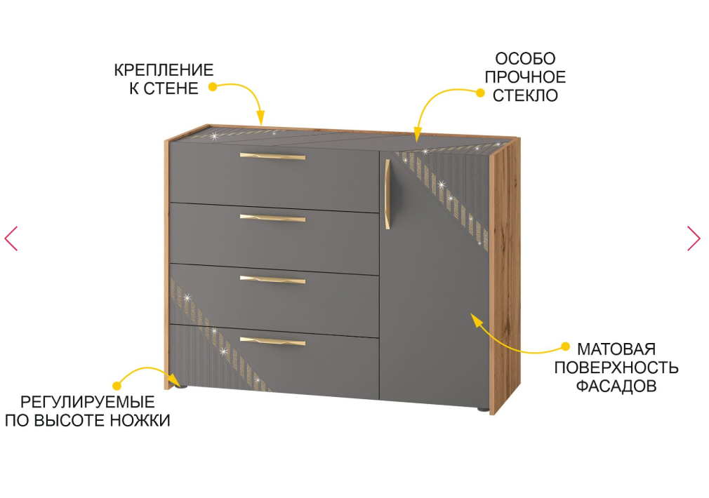 Комод произведен из МДФ и ЛДСП повышенной плотности. Материал устойчив к механическим и термическим воздействиям. ЛДСП выдерживает min 300 циклов на истирание, что почти в 5 раз больше, чем требуется по ГОСТу (min 65).