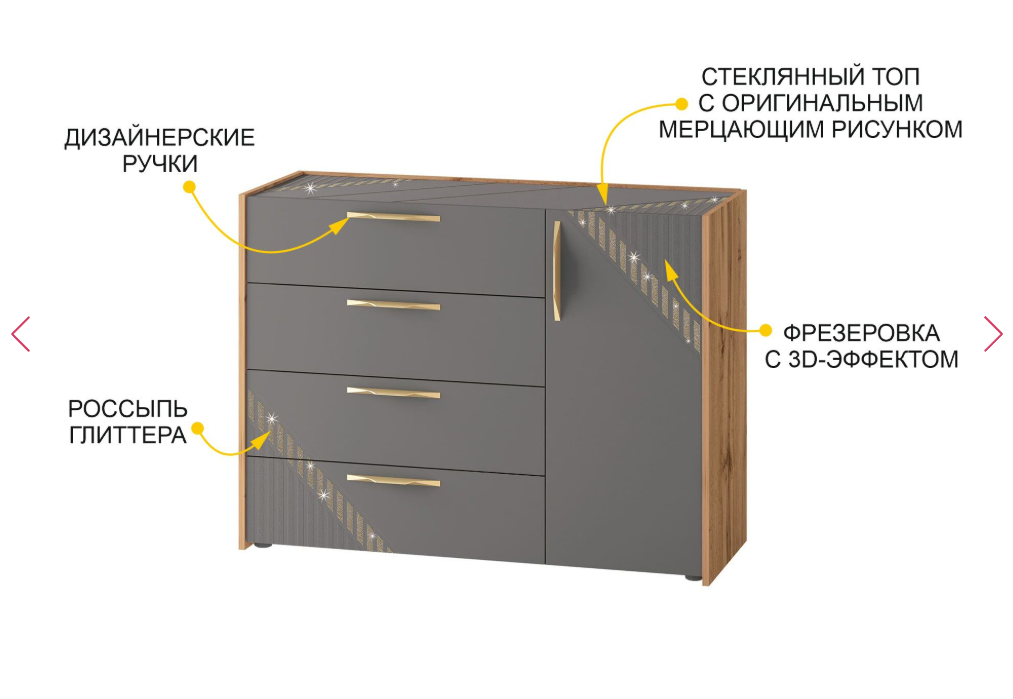 Топ комода декорирован дизайнерским рисунком на стекле. Сочетание матовой и глянцевой поверхности формирует оригинальный узор, который плавно переходит в рисунок на фасаде. Благодаря наличию стекла на крышке комода глиттерный рисунок не стирается и не выцветает со временем.
