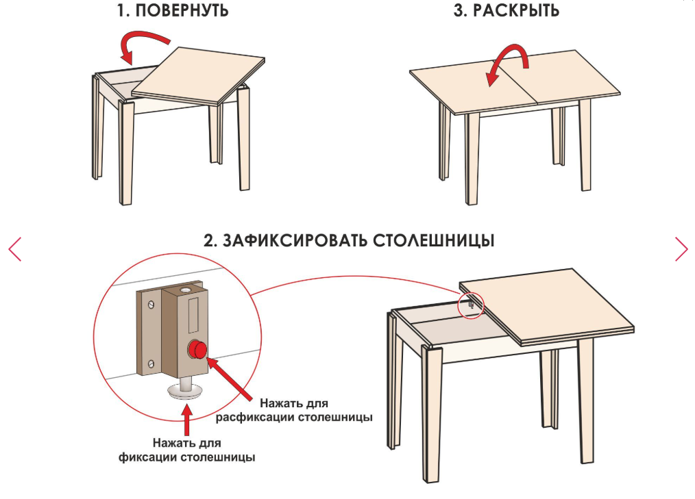 Надежный механизм обеспечивает длительную безопасную эксплуатацию стола и позволяет увеличить длину столешницы на 32 см, а ширину – на 30 см.