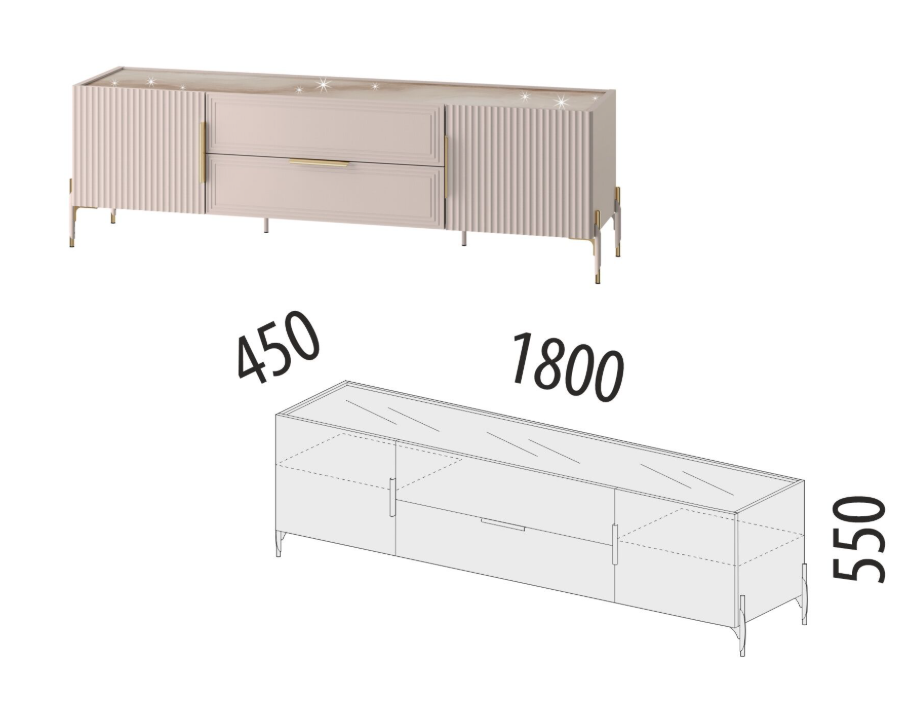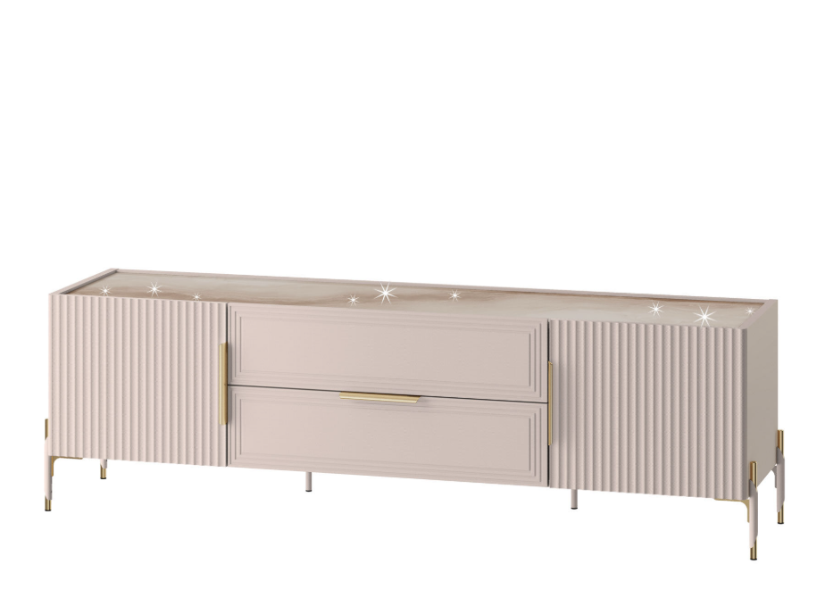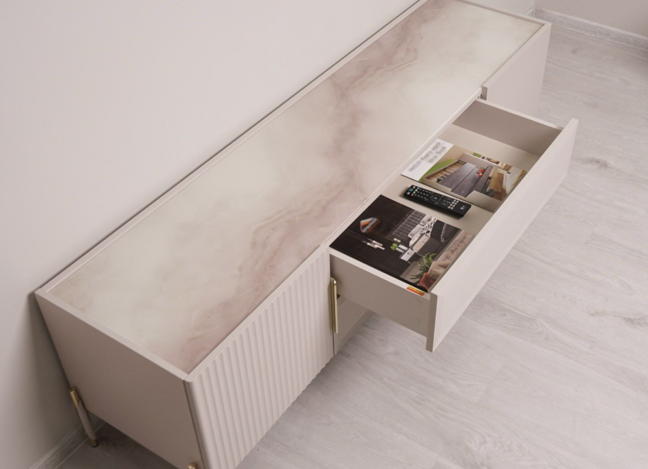 Стеклянный топ тумбы декорирован дизайнерским рисунком «Мрамор». Легкое мерцание глиттера придает поверхности глубину и добавляет в интерьер нотку роскоши.