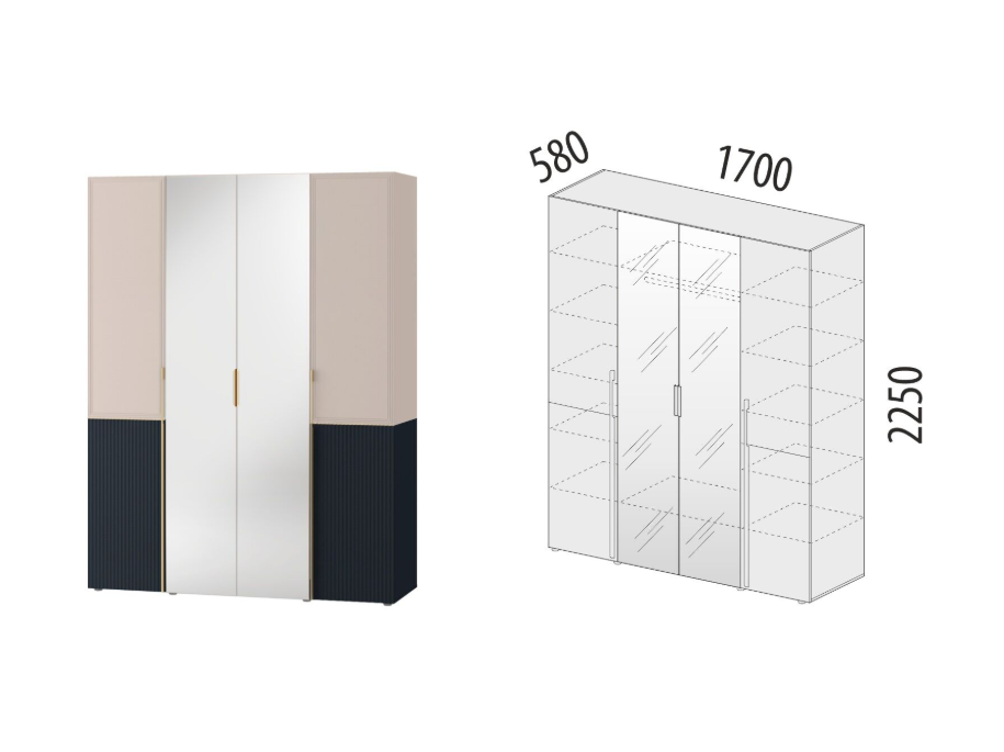 Дверцы шкафа выполнены из МДФ толщиной 18 мм, корпус и дверцы с зеркалом – из ЛДСП толщиной 16 мм.