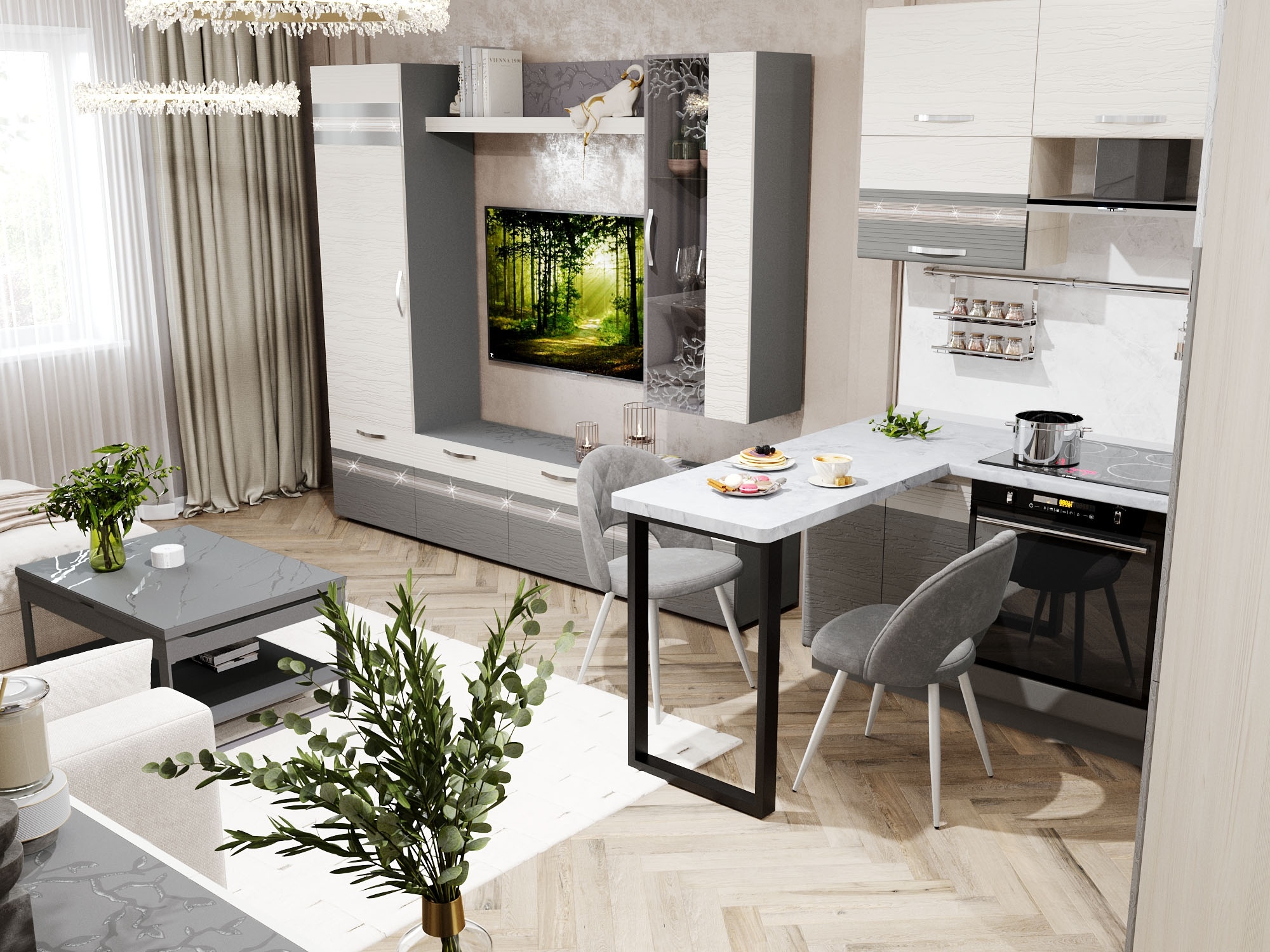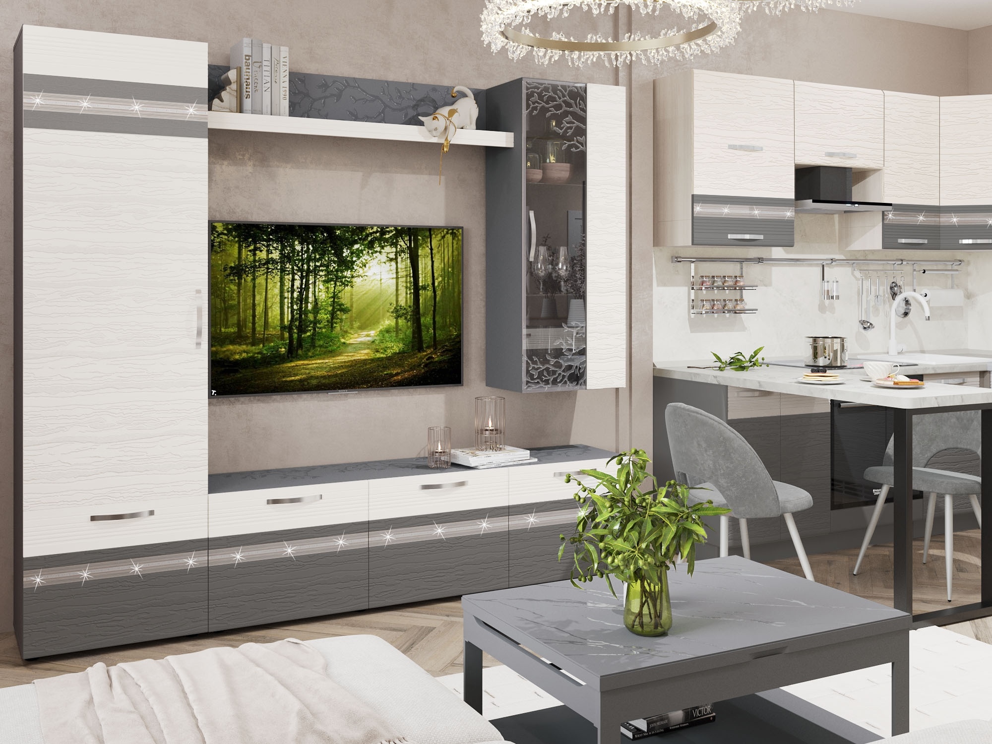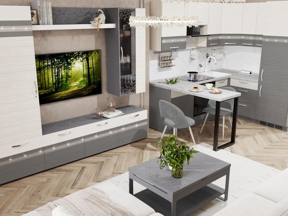 Единый стиль интерьера делает пространство уютным, функциональным и визуально цельным. С «Графит» Вам не придется подбирать каждый элемент — кухня и гостиная уже сочетаются идеально.