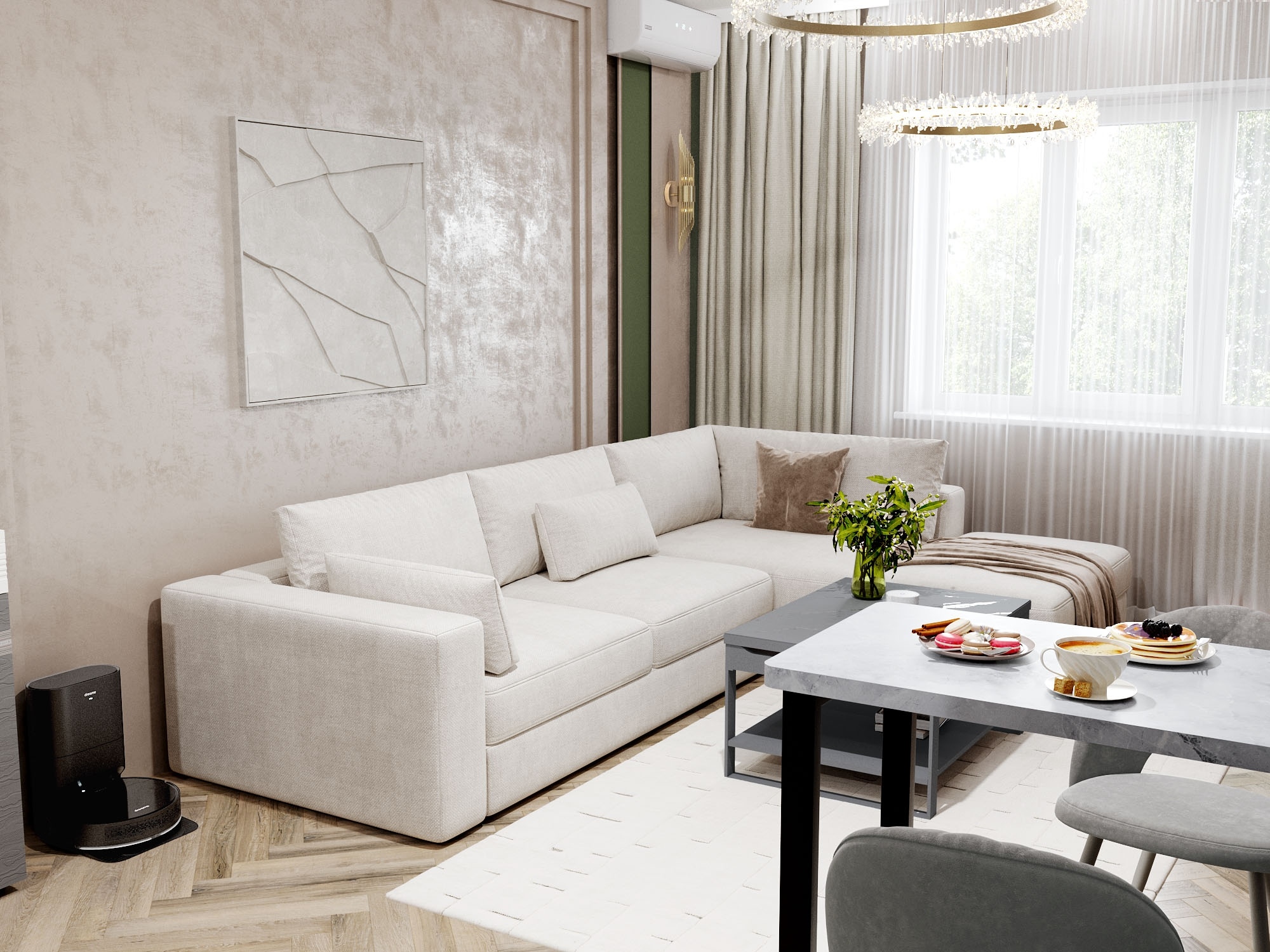 Результат: гармоничное, уютное пространство кухни и гостиной, с атмосферой спокойствия, умиротворения и легкой роскоши.